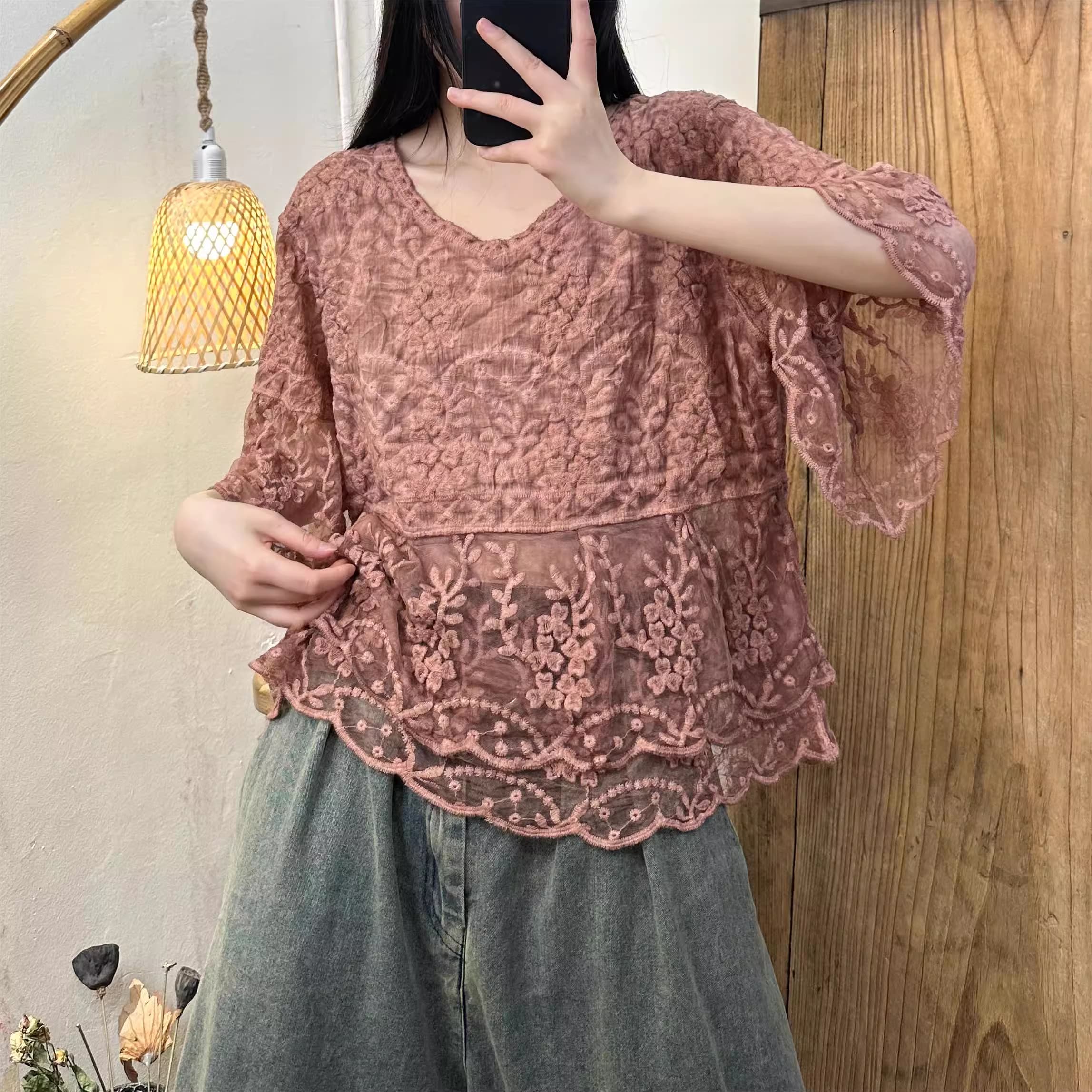 Sản phẩm áo ren hoa tay loe cực điệu đến từ H u a l o u, mẫu 2024, trong phong cách trẻ trung năng động dành cho mùa hè.